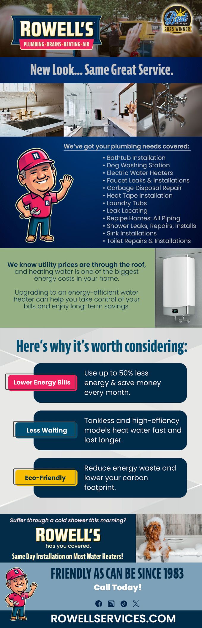 "Friendly As Can Be Since 1983!" When you need help with your plumbing, drains, heating, cooling or electrical in Bedford, you can always rely on Rowell's Services! Call us now or book online!