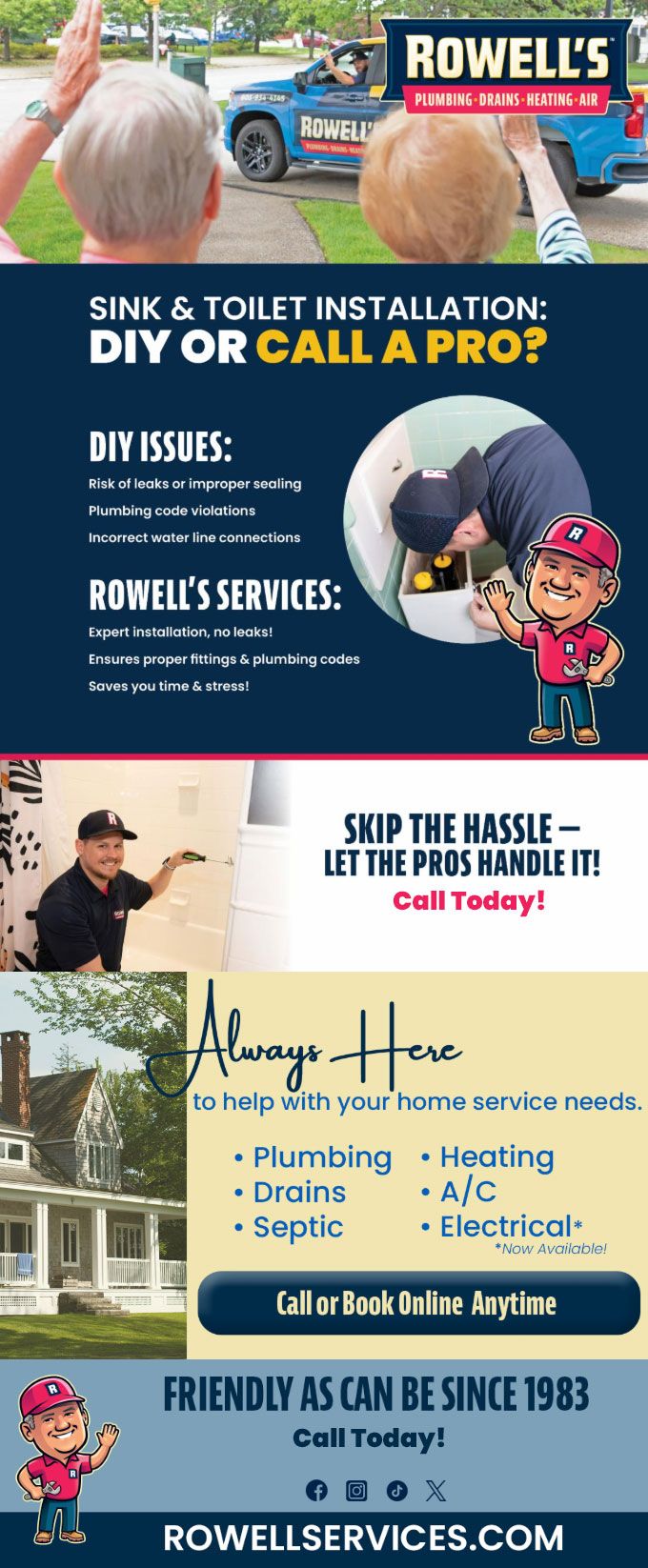 "Friendly As Can Be Since 1983!" When you need help with your plumbing, drains, heating, cooling or electrical in Bedford, you can always rely on Rowell's Services! Call us now or book online!